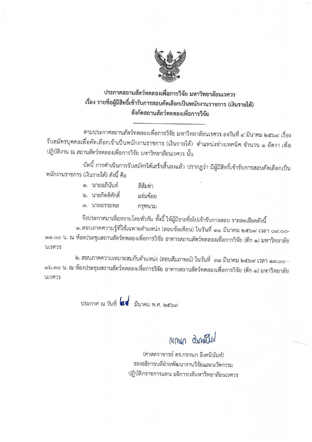 สถานสัตว์ทดลองเพื่อการวิจัย มหาวิทยาลัยนเรศวร ได้รับใบรับรอง Certificate of Conformity สำหรับห้องปฏิบัติการความปลอดภัยทางชีวภาพระดับ 3 (ABSL-3) (5/7/2025)